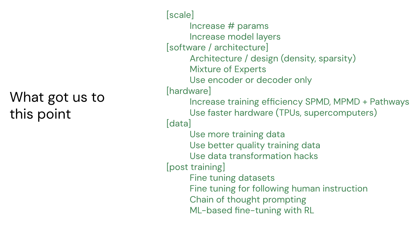 Efficiency: Innovations in architecture (like Mixture of Experts) and training infrastructure (like Pathways) are critical for managing computational costs.